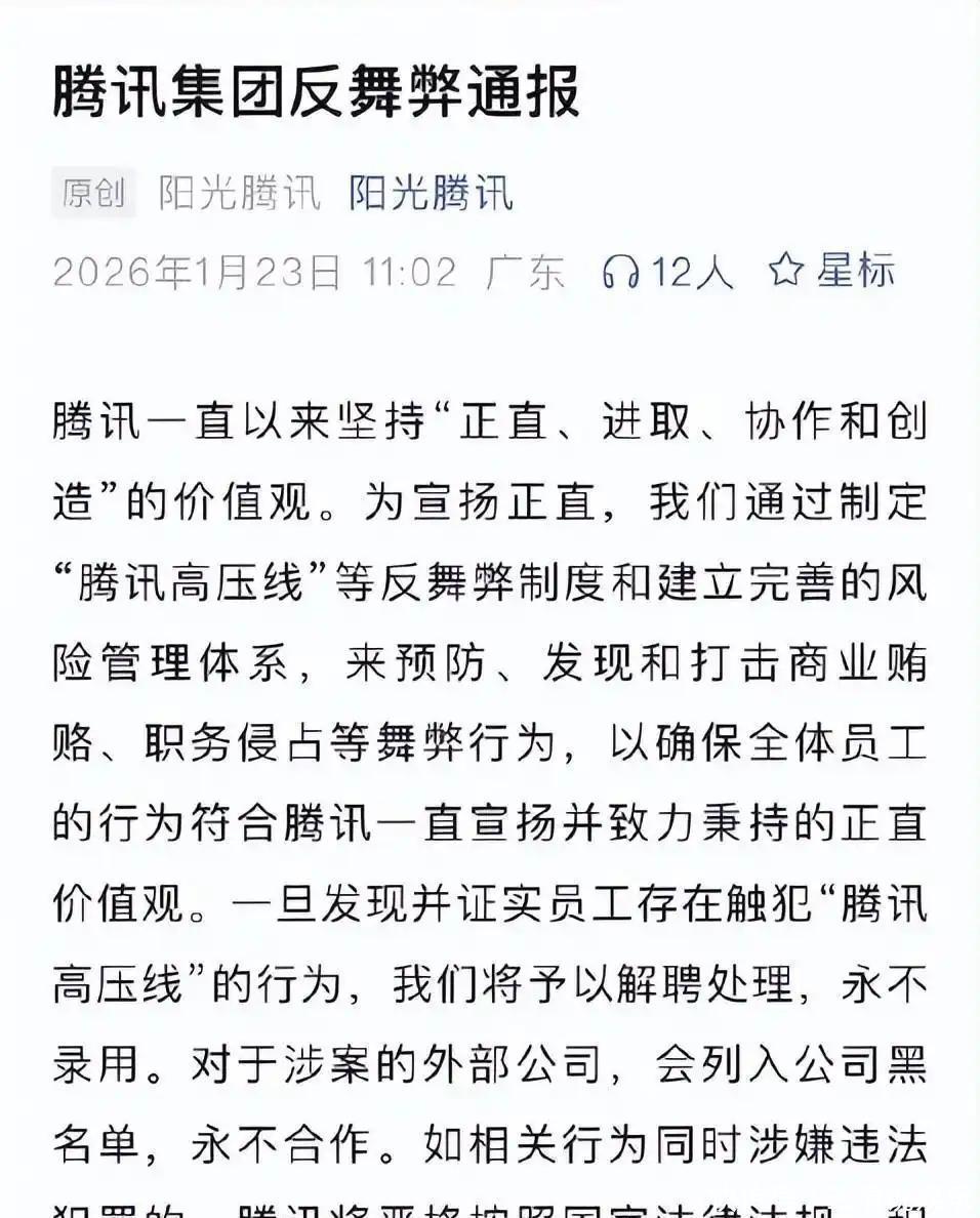 自是,世间真假难辨,外人往往难以洞察。唯有当圈内纷争暴露于众,方有人肯睁开双眼,而在此之前,大抵是各顾各路,对诸多事态选择视而不见。女制片人被抓众所周知,电影和电视剧的制作领域深不可测,投入的资金往往高达数千万甚至上亿,而背后的资金分配内情则鲜为人知。1月23日,腾讯发布反舞弊通报。