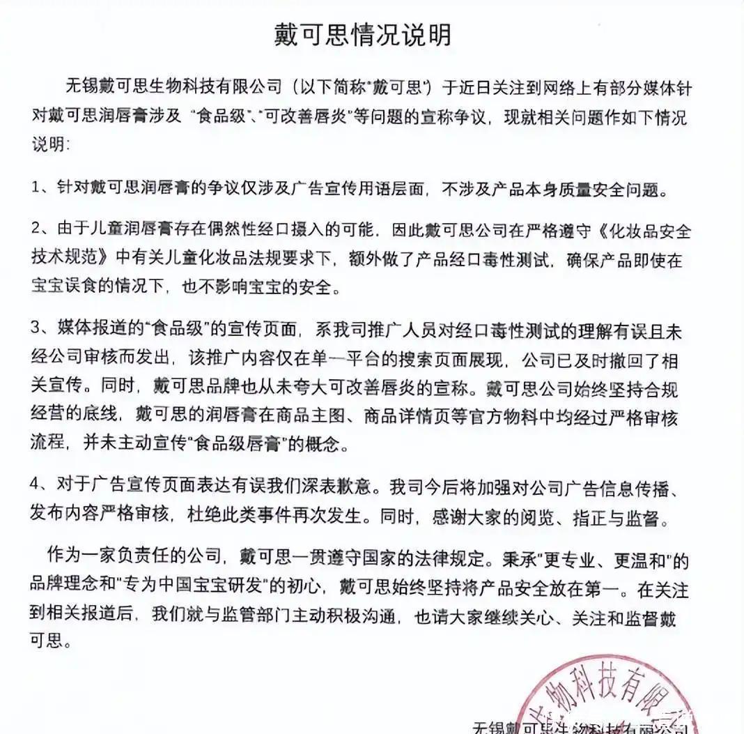 1月22日,有媒体报道,无锡市新吴区市场监管局近期对戴可思品牌进行了立案调查。该品牌的一款儿童唇膏被标称为“食品级润唇膏”,此举涉嫌违反《儿童化妆品监督管理规定》。
